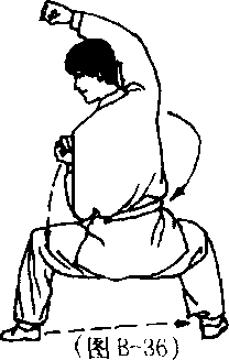 (2)接上动,上体略左转; 左脚向左落步,右脚不变,两腿屈 膝成马步;同时,左拳小臂外旋, 由上向下、向胸前滚压,力达左小 臂,拳心斜向后上方,拳眼斜向 前;右拳由下经头顶向左上方击 出,拳心向下,拳眼向外,力达拳 面,稍高于头;目视左前方。(图B- 36)