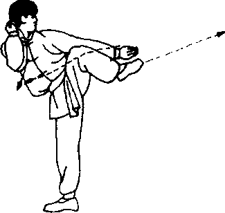 (1)接上式,上体右转,重心 前移;右腿直立,左脚屈膝提起, 脚掌斜向上;同时,左掌变拳,向 左上方斜格,置于左前上方,拳心 向后,拳眼向外;右拳由前向下、 向后撩格,置于身体右后侧,拳心 向上,拳眼向后,高与腰齐;目视