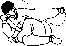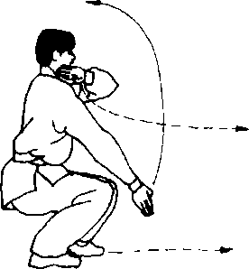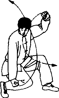(1)接上式,上体不变;重心 移至两腿之间,两腿下蹲,右脚 掌撑地前跪;右拳由上向后、向 下划弧抄拳,置于右膝外侧处, 拳心向上,拳眼向外;左掌变拳 小臂内旋上架置于头上方,拳心 斜向前,拳眼斜向下,目视右拳。 (图 B-54)