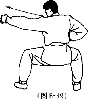 时,右拳回拉,屈肘置于右腰侧, 拳心斜向后,拳眼向上;左拳旋臂 转腕经腰间向左立拳冲出,拳心 向前,拳眼向上,高与肩平,力达 拳面;目视左拳。(图B-49)