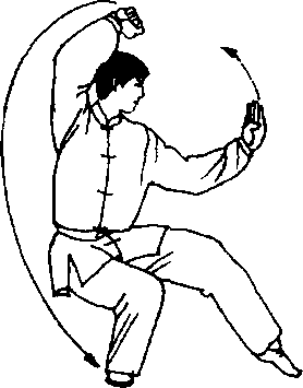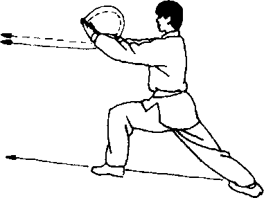要点:右拳上架要转臂旋腕 并向后带拉,形成一滚劲;左推 掌要拧腰、转体、送肩。