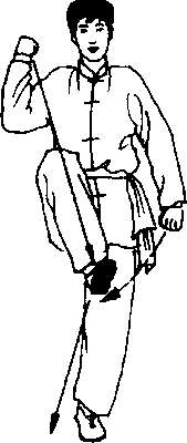 (2)接上动,上体略右转;左腿 伸膝直立,右腿屈膝上提,脚尖勾起, 置于左膝前上方;同时,右拳由下向 左抄起,经胸前向右横格,屈肘置于 右肩侧前上方,拳心向后,拳眼向外, 高与右耳平;左拳由上经右,直臂向 下压拨,置于左胯外侧处,拳心向后, 拳眼向内;目视前方。(图B-55)