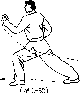 接上式,上体右转90。;右 脚尖外摆顺直,左脚尖里扣,成右 弓步;同时,左拳由后向前、向上 抄击,拳心向内,拳眼向外,高与 肩平;右掌变拳屈肘抱于腰间;目 视左拳。(图C-92)