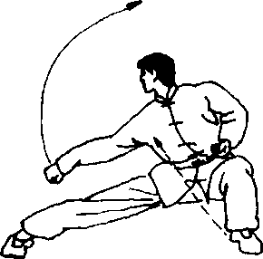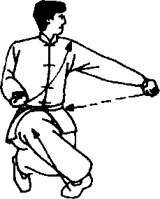 要点:弓步和抄拳同时进行, 抄拳要抖肩发力,力达拳面。