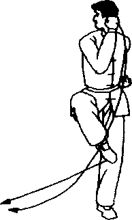 接上式,上体左转,重心上 移;右脚不变唯腿直起,左腿屈膝 提起;同时,右拳由下向上屈肘架 于头额部上方约10公分处,拳心 向下,拳眼向后;左拳置于腹前, 拳心向上,拳眼向外;目视左前 方。(图 C-96)