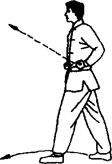 (2) 接上动,上体略右转;右 脚向前迈一步,左脚不变;同时, 左拳变指向前插出,食指与中指 相距约1.5公分,手心向下;右拳 不变;目视左指。(图C-98)