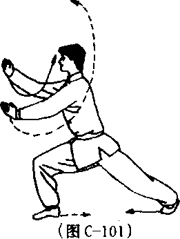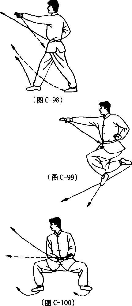 (图 C-95)(图 C-95)(图 C-96)(图 C-96)(图 097)(图 097)(1)接上式,上体右转90° ; 左腿随转体向右前方落步,右脚 外摆前顺;同时,两拳抱于腰间; 目视前方。(图C-97)