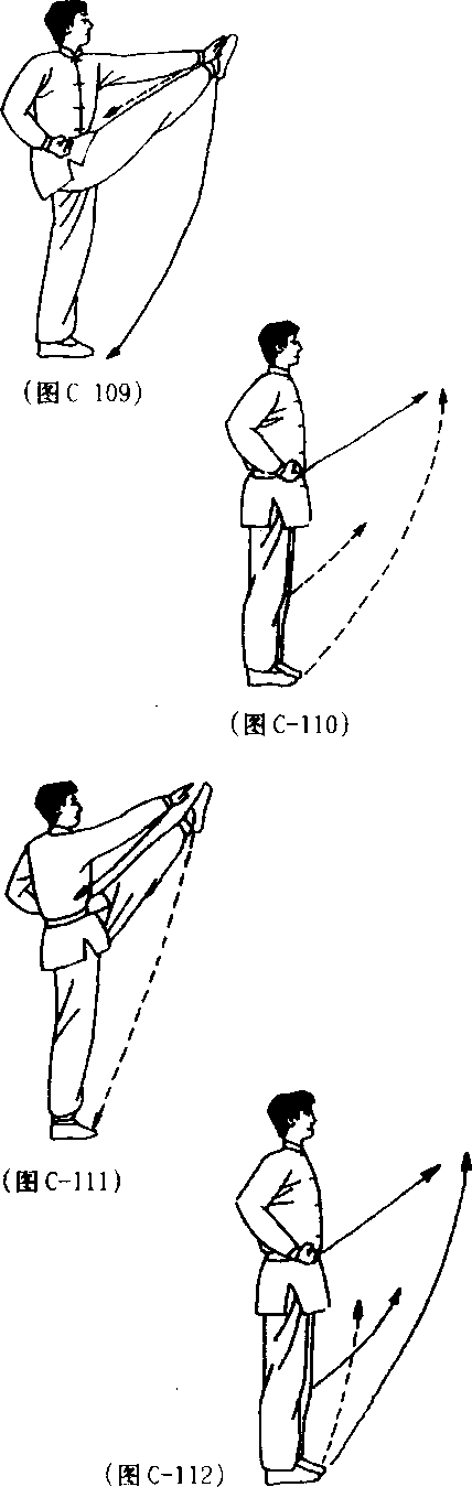 (4) 接上动,上体不变;左腿 屈膝提起向前方弹踢,脚面绷平; 同时,右拳变掌小臂丙旋由后向 前迎拍左脚面,掌心向下,虎口向 里,高与肩齐;目视左脚。(图C- 111)