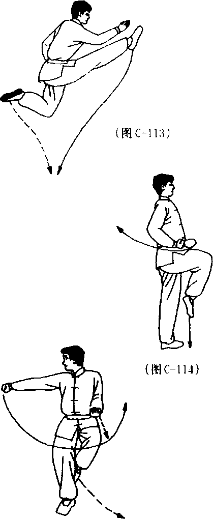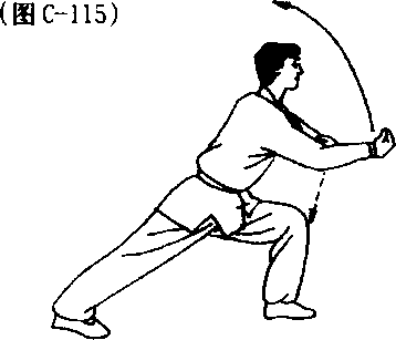 (2) 接上动,上体右转90° ; 右脚震脚落地,左脚面扣于右膝 后;同时,右掌变拳,由前向下, 向后抡臂置于身体右后侧,拳心 向下,拳眼向外,高略低于肩;左 拳不变,目视右拳。(图C-115)