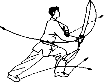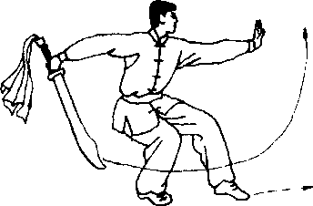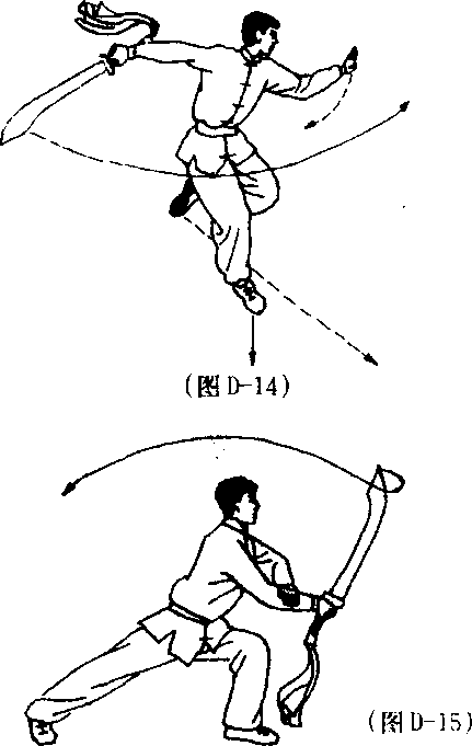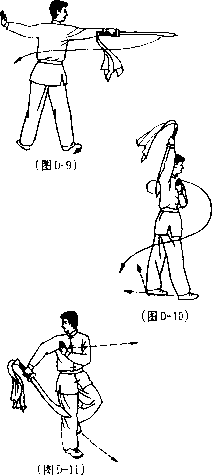 (2) 接上动,左脚向前上一 步,身体右转90° ;同时,右手持 刀随体转向前、向右平扫,刀尖向 右,刀刃向后,高与肩平;左掌向 左推出,掌心朝左,掌指朝上,高 与肩平;目视刀身。(图D-9)