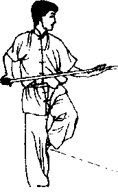(1)接上式,身体左转180。; 右腿直立,左腿随转体屈膝提起, 脚背扣于右膝后;同时,两手虎口 相对,握棍随体转平拨。(图F-74)