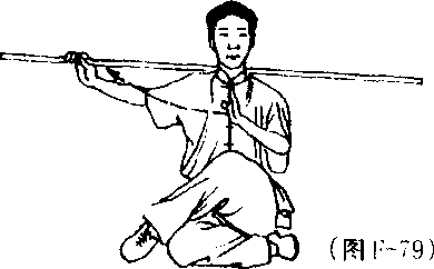 (3)接上动,上体继续左转 180。;右腿向左腿后叉步,两腿 屈膝成坐盘;同时,右手握棍使之 平背于肩上,棍梢朝左,左掌向上 至胸前约20公分处成立掌,掌心 朝右,掌指朝上,手指高与腭平; 目视前方。(图F-79)