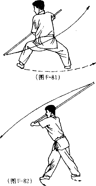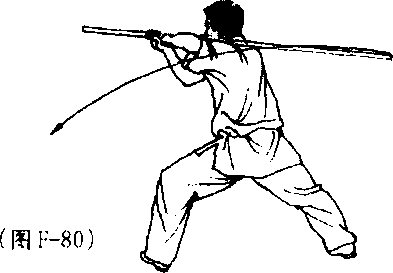 朝左,高于肩平;目视棍梢。(图F- 电 )