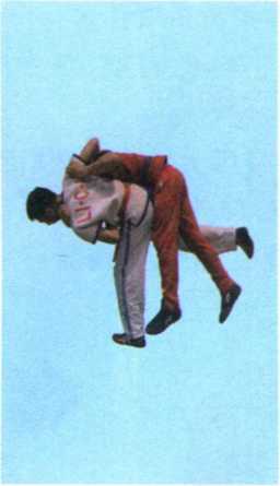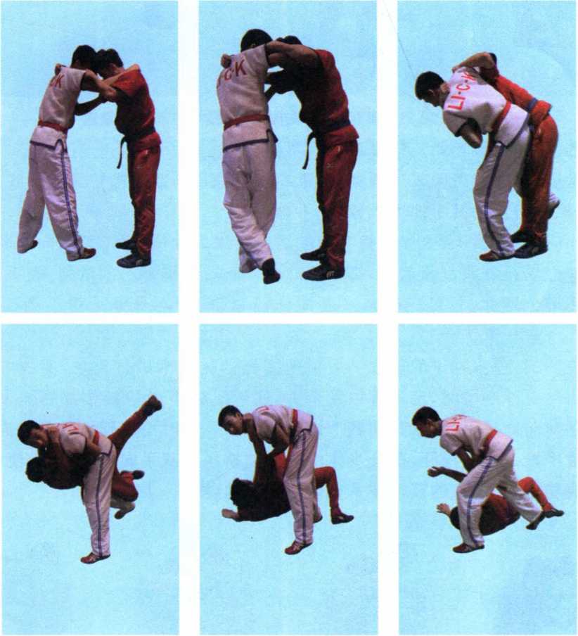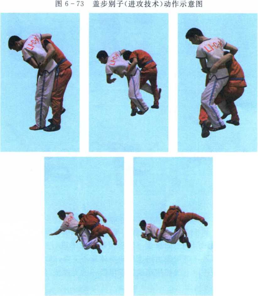 反攻方法:盖步别子的反攻一般采用插扦挡腿技术进行反攻,实战中,当甲突 然盖步前使夹脖别子时,乙不等甲发全力,底手迅速下滑抱其腰部屈腿重心下降, 头部随之横向倚挤甲的胸部,使其上体向侧倾斜。同时用底腿从其身后插入裆中, 用力挡拨甲惟一的支撑腿,配合身体由后向前挤压和双手向前的推送,使甲不但进 攻不能成功,还会被乙的反攻技术摔得前仆倒地(图6-74)。