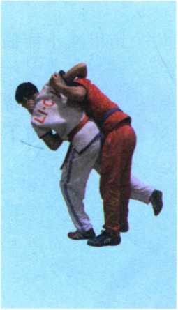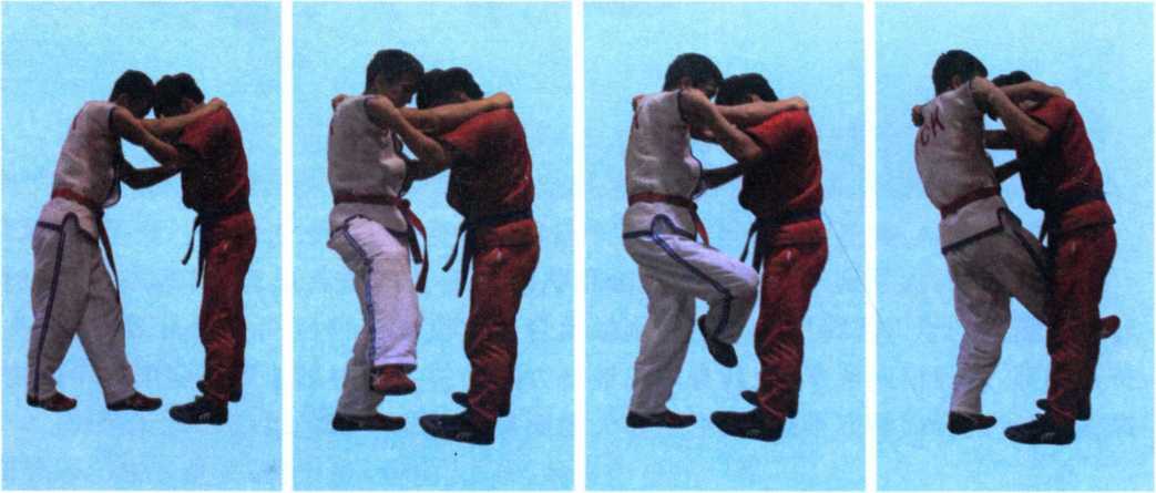 反攻方法:大领别子的反攻一般采用扒腰削腿技术进行反攻,实战中,甲突然 转体伸腿使别子。乙待甲的攻击腿刚触及自己被攻击腿时,底手迅速下滑扒腰,头 挤其胸部,底腿横向滑步,使其身体向被挤方向倾斜。同时迅速用底腿削绊甲的支 撑腿,双手配合向侧方推捅,使甲重心失衡而摔倒(图6-72)。
