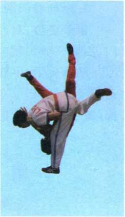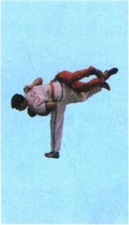 动作应用:实战中,甲双手抓好把位,横向圆拉走跤步扯动对手,当自己的活腿 靠近对方前伸腿时,突然双手合力向体前揪带,活腿随之前伸外展,猛力地抽别对 手膝关节以下的部位,同时身体配合前倾长腰、转体、背脸,迫使对手双腿离地,腾 空摔倒在地(图6-71)。