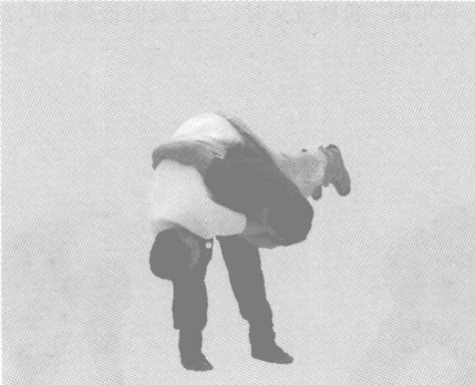 动作过程:授臂入俗称“按头振”。甲用手臂援住乙臂,紧揪乙底手, 迅速埴腰、低头、崩腿、拉擦、按头,将乙摔倒(图7-39、图7-40、图