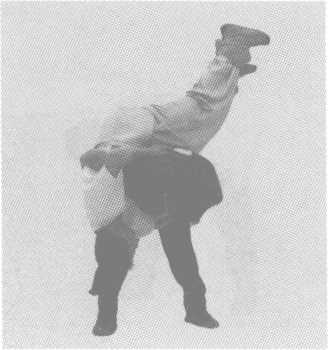 图 7-36图 7-36动作过程:甲乙揪握好以后都力求主动向前抢胯。甲抢在前面,并借助 乙的前抢力量,迅速填腰、躬身,紧勒上下手,并拱臀、崩腿、拉擦,把乙 入起摔倒在地。套胯入关键要看腰上功夫,看谁能抢先,谁抢先谁就有可能 把对方入起(图7 -36、图7 -37、图7-38)0