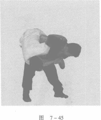 动作过程:乙将甲腰拿住,甲猛一凹胯、离胁,让出一臂之隙,随即把 手和前臂投入(不可反关节),牢牢圈住乙拌腰之臂的一段上臂(肘关节以 上),同时紧拉底手,躬身、拱臀、崩腿、拉擦,使乙翻倒(图7-42图