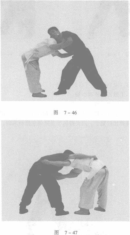 动作过程:甲左(右)手揪握住乙后契,上步用开弓动作,向身后耘乙, 嬷后填腰入胯将乙提翻摔倒(图7-46、图7-47、图7-48、图7 - 49) □
