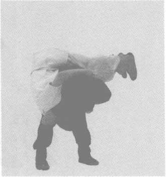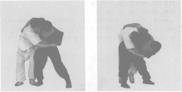动作过程:凡把对方背在背上过肩摔下的绊子,一般都用投臂或盖契, 而夹脖使入就显得比较蹩手,因夹脖的手是揪领变把而来的。此种技术动作