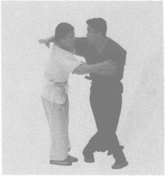 比较简练,一般腰力大者使用较为有利。甲用双手拢对方双肩,猛然把对方 要进来后,立即背步、填腰,同时猛拢臂、夹脖、崩腿、拉擦,使入把乙摔 倒(图 7-50、图 7-51、图 7-52)0