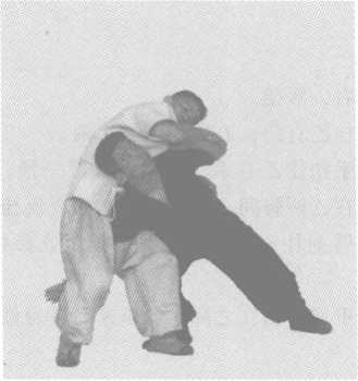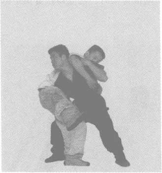 袖的手拉摞;另一点是头部仰靠乙胸部。与此同时,甲一条腿挡住乙腿,使 乙腿不得往后挪动,另外一臂授入乙裆中,把乙横扳起来,摔倒在地(图