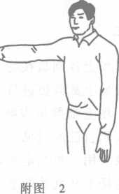 (二)比赛中的暂停:一臂(右臂或左臂)向前伸直,指向运动员(拇 指在上),同时发出“停”的口令(附图2)。