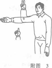 (三)得分:一臂平举(右手或左手)指向得分的运动员(拇指在上), 而后屈肘,前臂上举,并以手指示分。得1分伸出食指,得2分伸出食指和 中指(附图3)。