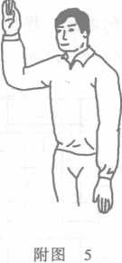(六) 劝告:一臂屈肘侧上举,五指并拢,靠近受劝告的运动员(附图 5)o