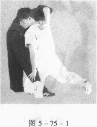 实战中,乙支顶甲小袖大领,使 甲不得近身。甲突然晃头从乙的右臂 钻出,乙误以为甲要使用搬打,必然 重心后移。甲迅速将活腿插人乙裆中 跪打乙的底腿,随之上体欺身用头撞 击其胸腹,双手配合向其身后大力支 捅,导致乙失去重心而摔倒(图 5-75-1、5-75-2)0
