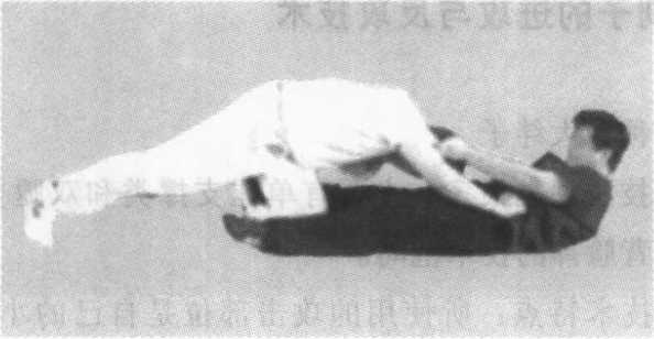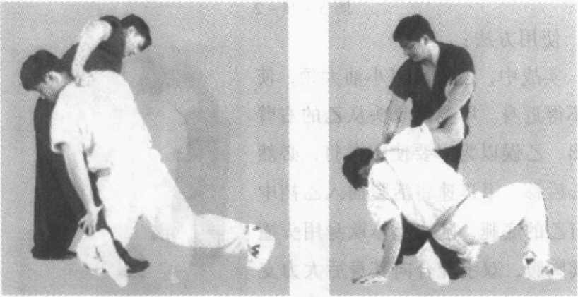 实战中,当甲突然串头用攻击腿去跪打乙的底腿时,乙有 意识地不做逃腿。待甲的攻击腿触及乙的攻击腿时,乙迅速向 外做拧钻动作,上面转体,抓袖的底手和抓领的活手配合大力 向下摁压,使甲的攻击力随着乙的转体而改变方向,肩袖又遭 乙的大力攻击,不但进攻失败,还会被乙的反攻动作所摔倒 (图5-76- 1、5-76-2)0