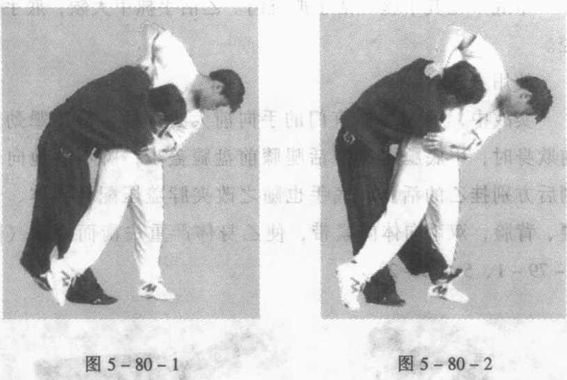 向前的推送,使甲不但进攻不能成功,还会被乙的反攻技术摔 得前仆倒地(图5-80-1、5-80-2)。