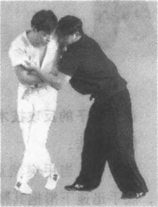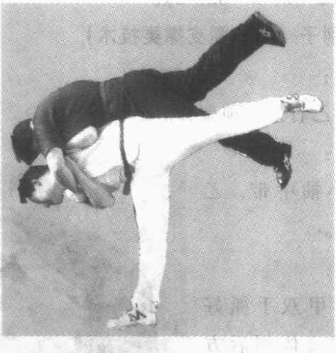 实战中,当甲突然盖步前使夹脖别子时,乙不等甲发全 力,底手迅速下滑抱其腰部屈腿重心下降,头部随之横向倚挤 甲的胸部,使其上体向侧倾斜。同时用底腿从其身后插人裆 中,用力挡拨甲惟一的支撑腿,配合身体由后向前挤压和双手