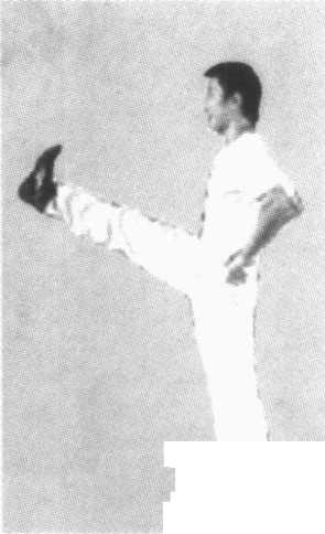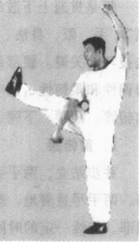 左脚向前上半步,左脚支撑,右脚脚 尖勾起向前额处猛踢。左右两腿交替 进行(图3-9)。