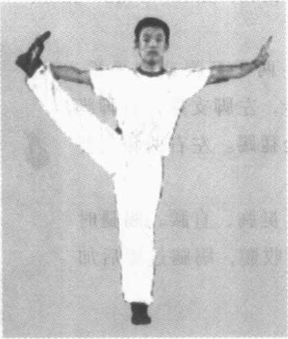 图 3 - 10向右耳侧踢起,同时左臂屈肘上举亮 掌,右臂屈肘立掌于左肩前或垂于裆 前,眼向前平视。左右交替练习(图 3-10)。