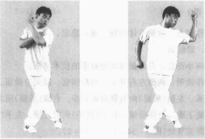 动作说明:两腿左右开立,与肩同宽,膝关节微屈,两手 自然下垂。左腿(活腿)向左斜上方上一大步,滑管对方的右 腿,右腿(底腿)随之跟步。左手(活手)向斜上方搀其右臂而后 臂弯曲约90°,向回横向搀拉,右手(底手)向右身侧后紧拉。 右腿搀管时的动作与左腿搀管的方向相反。左右交替练习(图 3-35-1、3-35-2)0