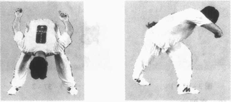 动作说明:练习时两腿开立成跤架。右腿背步到左腿后做 支撑腿,随之两脚以脚尖为轴转体180°屈膝,左腿立即向后上 方猛力挑勾子,左手(底手)向身后紧拉,右手(活手)猛力由上 向支撑脚方向裹压。俯腰低头,背脸,支撑腿向后崩拉(图 3-37 - 1、3-37-2)0