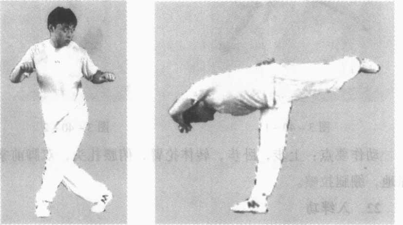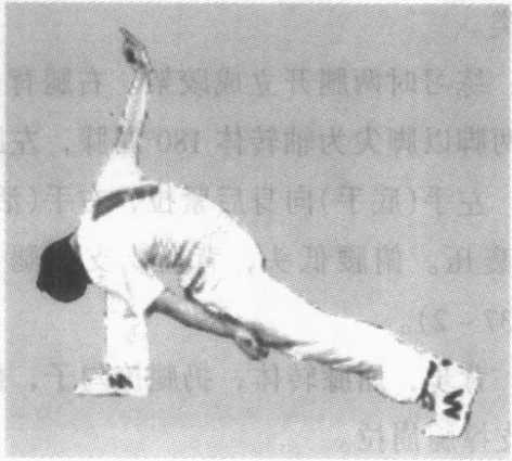动作说明:练习时两腿开立成跤架姿势。右腿(底腿)背步 置于左脚后做支撑腿。同时双手在胸前向自己怀里做紧拉动 作,左腿随即外展,横向后撩,上体转体长腰背脸,底手紧于 身后,活手向头上部位横揪,使身体成单腿支撑的水平姿势。 右腿抽别时的动作与左腿抽别时的方向相反。左右交替练习 (图 3-39- 1、3-39-2)0