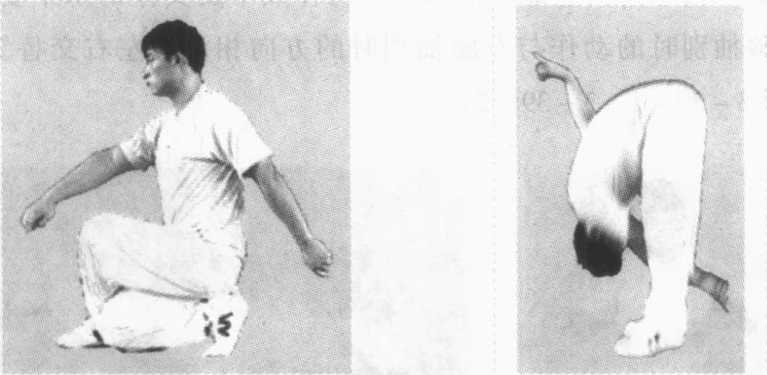 动作要点:上步,卧步,转体抡臂,俯腰扎头,双脚前掌 抓地,绷腿拉嚓。