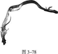 早年都用线麻编成两头细中间粗的粗辫子,两手拿握住两 头。后来多用两股皮条或铁链代替。三种用具各有一种劲。抖 皮条的基础练习是“大四步”,即上步、背步共走四个位置, 同时随上步两手用暴脆劲抻 抖皮条。由于皮条是两条, 故抖起来发出有节赛的崩击 之声。它对发展臂部的崩、 捅、拉、挣和腰部的扭、转、 崩、长以及腿部的拧、戢、 钻、弓、崩等各种力量都有 很大的帮助。(图3-78)