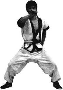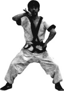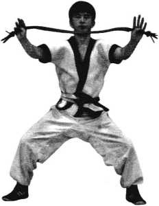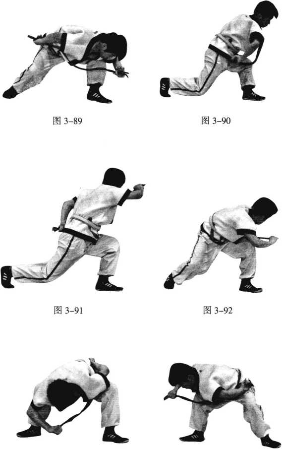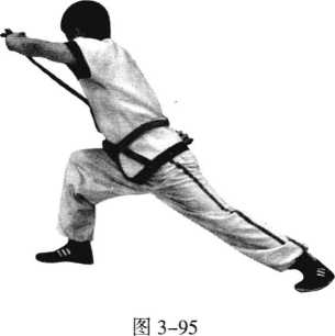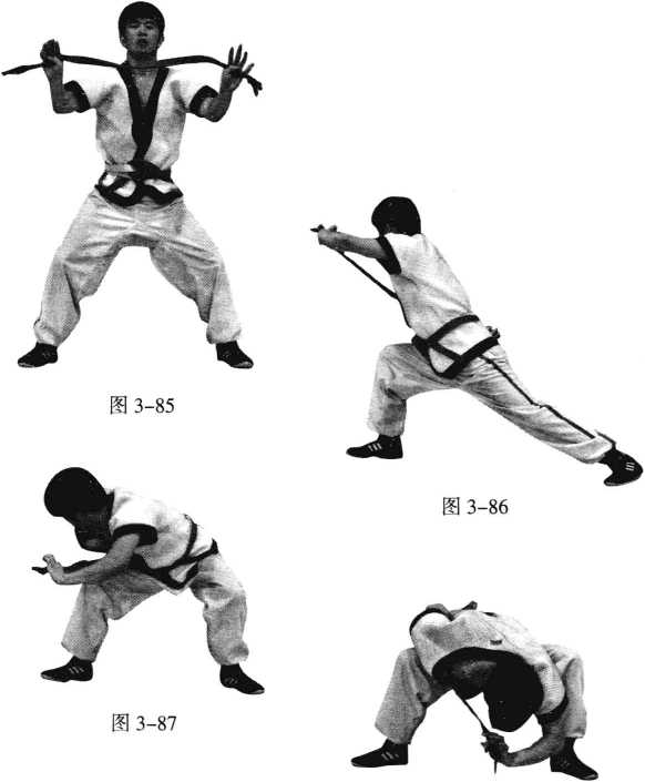 马步站立,双手攥紧皮条。左脚蹬地、右脚外展,身体 突然左转成右弓步,双手上下绷抖皮条,低头注视皮条,形 成赢桩姿势。左右动作相同,唯方向相反,可反复练习。 (图3-85~图 3-96)