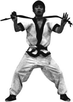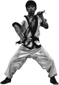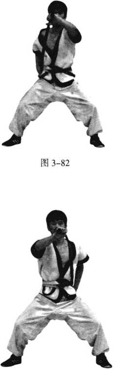 马步站立,双手攥紧皮条,左右转身;同时,两手臂前后 绷抖皮条,眼视皮条。左右动作相同,唯方向相反,可反复练 习。(图 3-79~图 3-84)