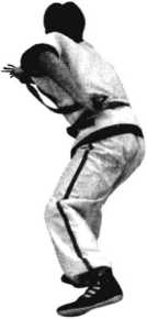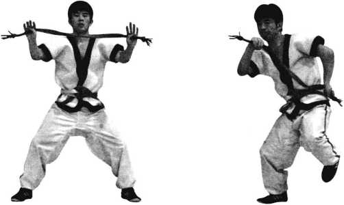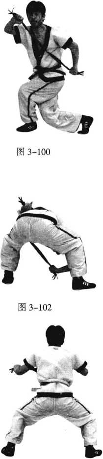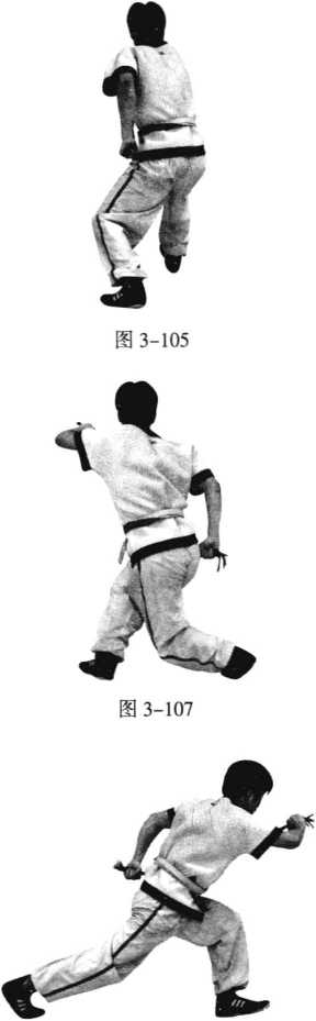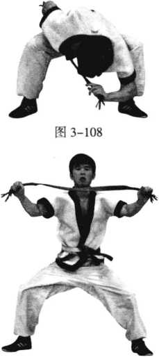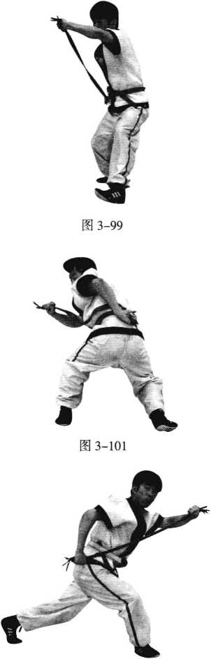 马步站立,双手攥紧皮条。先上左步同时左手绷抖皮条,紧 跟着卧步,双手绷抖皮条,低头,双脚蹬地、拧转,身体右转, 左手向右绷抖皮条,腿前弓后绷形成戢桩姿势,目注视皮条。左 右动作相同,唯方向相反,可反复练习。(图3-97~图3-110)图 3-106