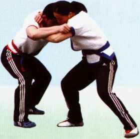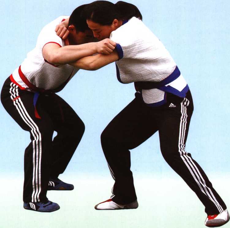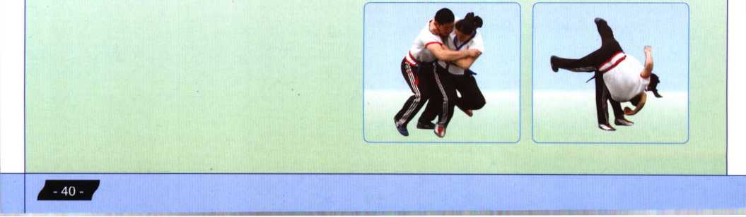2右手挟住乙头颈臀部贴乙小腹屈膝用跳蹦子方法使乙倒地。