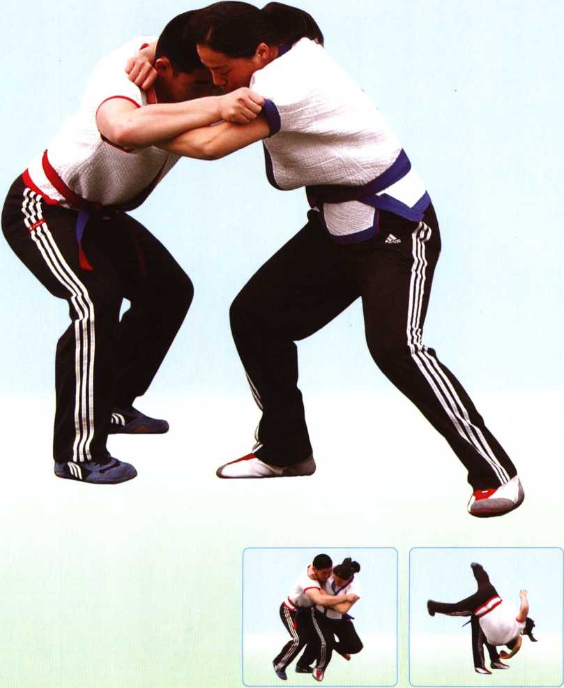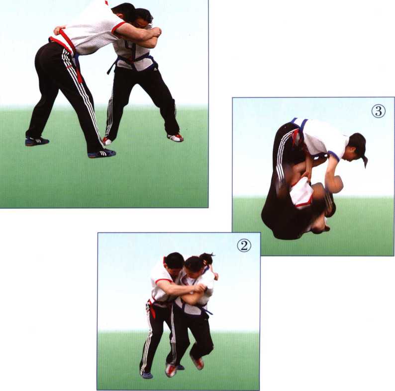 动作1甲盖乙后圈时左脚上步挤头(由乙面前自左向右把头部挤到甲右肩上)2同时右脚盖步转体背贴乙胸屈膝用蹦的方法使乙倒地。