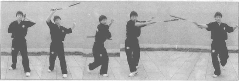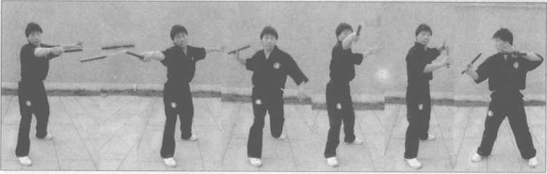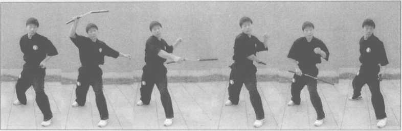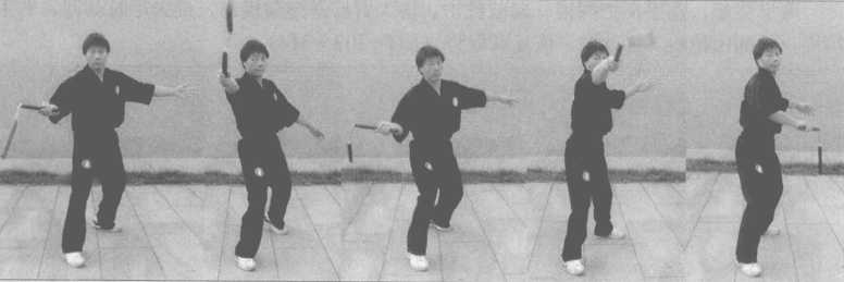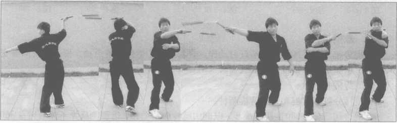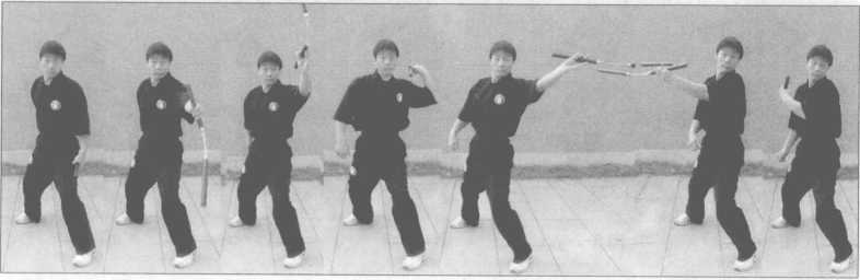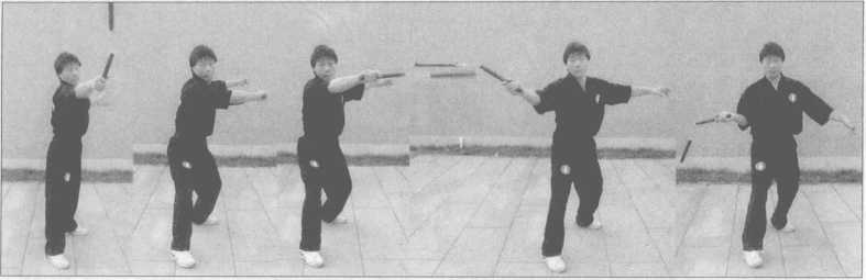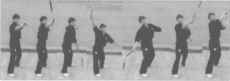 悬棍势起,右手挥棍做流星赶月动作,并利用链子惯性向前点抽,棍去尽时向前交 叉斜抽,借腰部反弹横抽,恢复悬棍势(图6-281?290)。