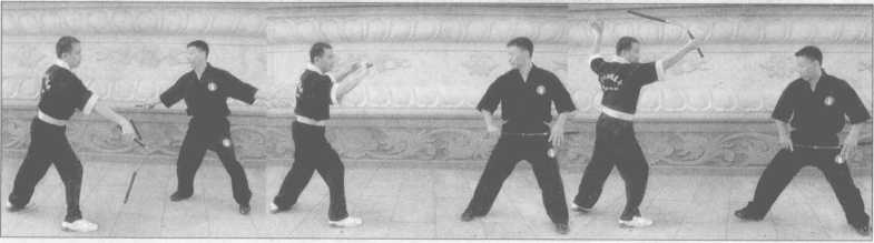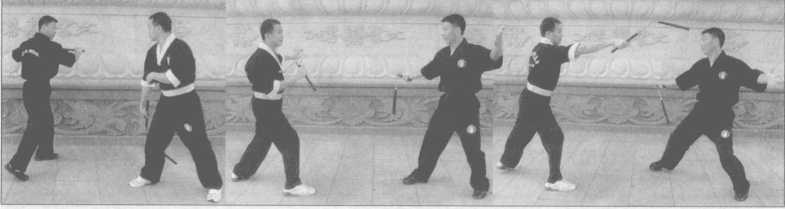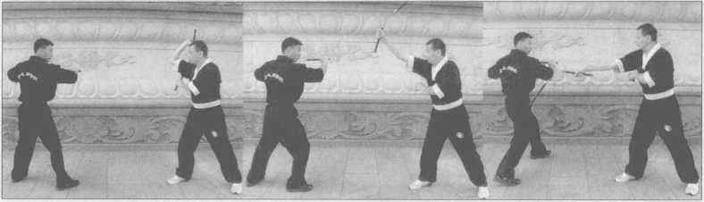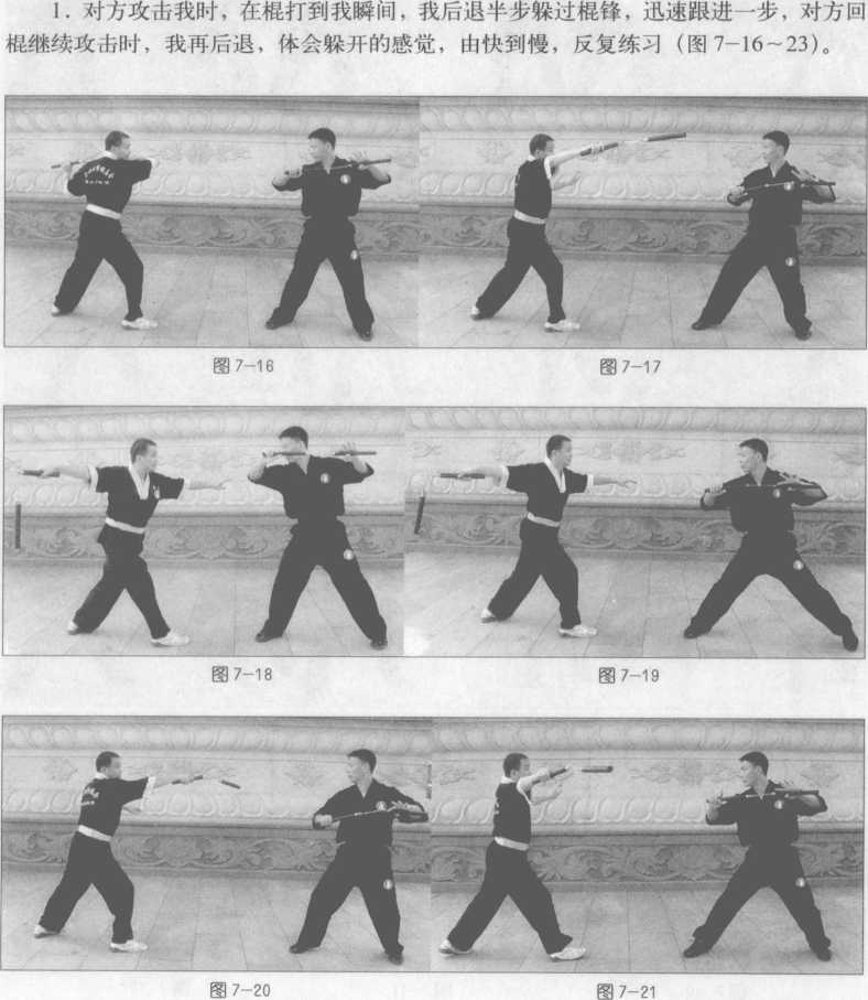 1 .对方用直线技法(点击、正劈、弹击)攻击我时,我练习向左或向右侧闪,攻击 者刚开始出棍由慢到快,练习者在躲开对方攻击时要有反击对方的意识(图7-1~7)。