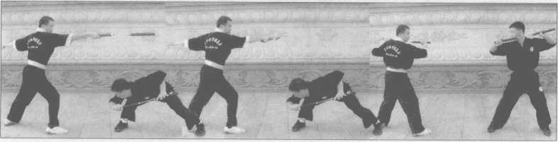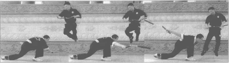 2 .对方用平线技法(横击或横扫)我时,我练习下潜或跳跃躲开对方的攻击,同样 在练习躲闪的同时有反击的意识(图7-8~15)。