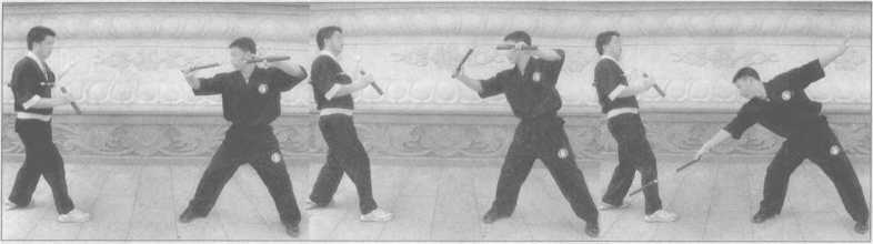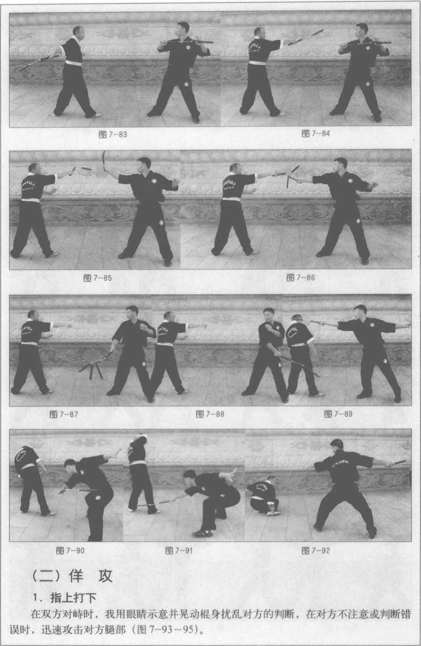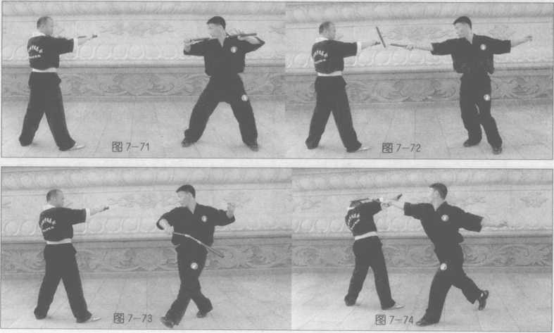 1.抢在对方出棍之前 在教练下达口令开始,“始”的尾音未落时,我迅速以疾进 步用弹棍弹击对方持棍之手,无论打中打不中,直接攻击对方头部,并迅速撤离对方棍 打击的范围,作好第二轮攻击的准备(图7-71~75)。